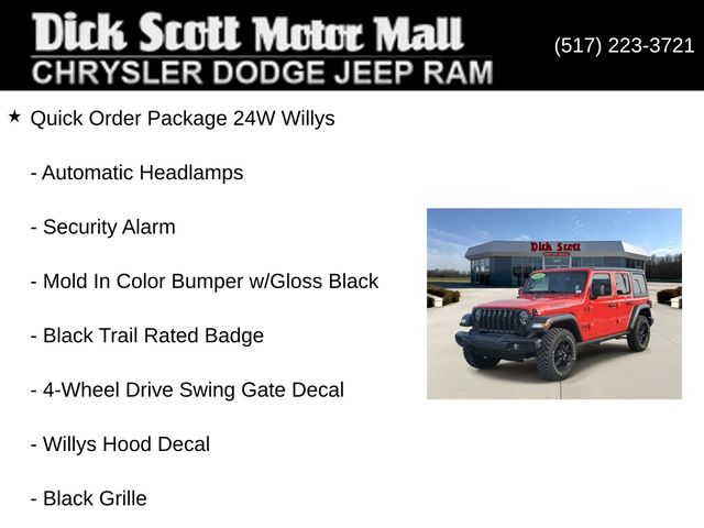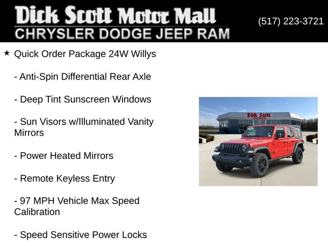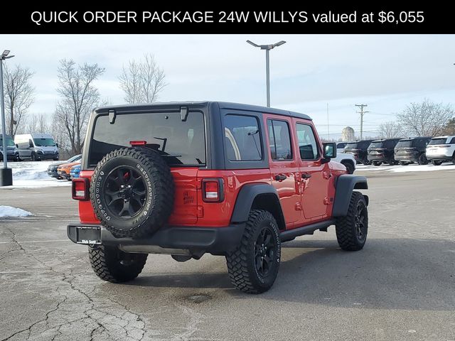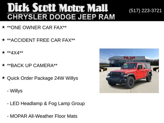 **ONE OWNER CAR FAX**, **ACCIDENT FREE CAR FAX**, **4X4**, **BACK UP CAMERA**, Wrangler Unlimited Willys, 4D Sport Utility, 3.6L V6 24V VVT, 8-Speed Automatic, 4WD, Firecracker Red Clearcoat, Black Cloth, 4-Wheel Disc Brakes, 4-Wheel Drive Swing Gate Decal, 97 MPH Vehicle Max Speed Calibration, ABS brakes, Anti-Spin Differential Rear Axle, Automatic Headlamps, Black Grille, Black Trail Rated Badge, Deep Tint Sunscreen Windows, Front 1-Touch Down Power Windows, Front LED Fog Lamps, Leather Wrapped Steering Wheel, LED Headlamp & Fog Lamp Group, LED Premium Reflector Headlamps, Matte Black Jeep Badge, Mold In Color Bumper w/Gloss Black, MOPAR All-Weather Floor Mats, Power Heated Mirrors, Quick Order Package 24W Willys, Remote Keyless Entry, Security Alarm, Speed Sensitive Power Locks, Sun Visors w/Illuminated Vanity Mirrors, Wheels: 17" x 7.5" Moab Black Aluminum, Willys, Willys Hood Decal. Odometer is 11258 miles below market average!