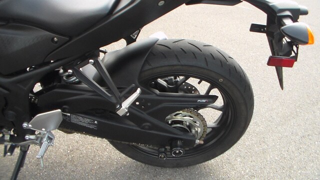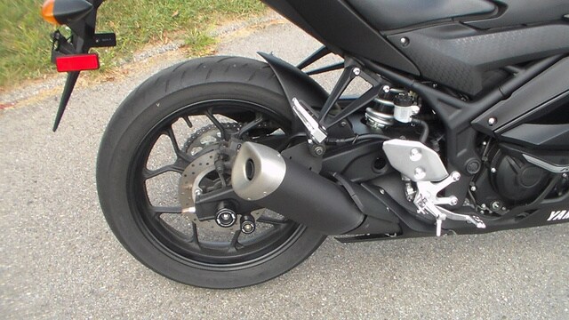 Engine Type: DOHC inline twin-cylinder; 8 valves Displacement: 321cc Bore and Stroke: 68.0mm x 44.1mm Cooling: Liquid Compression Ratio: 11.2:1 Fuel System: Fuel Injection Ignition: TCI: Transistor Controlled Ignition Transmission: 6-speed; multiplate clutch Final Drive: Chain Front Suspension: Inverted telescopic fork; 5.1 in. travel Rear Suspension: Monocross single shock, adjustable preload; 4.9 in. travel Front Brakes: 298mm hydraulic disc Rear Brakes: 220mm hydraulic disc Front Tire: 110/70-17 Dunlop® Sportmax® GPR-300 Rear Tire: 140/70-17 Dunlop® Sportmax® GPR-300 Wheelbase: 54.3 in. Seat Height: 30.7 in. Rake: 25.0 deg. Trail: 3.7 in. Fuel Capacity: 3.7 gal. MPG: 56 mpg Dry Weight: Curb Weight: 368 lb. Colors: Matte Black, Team Yamaha Blue